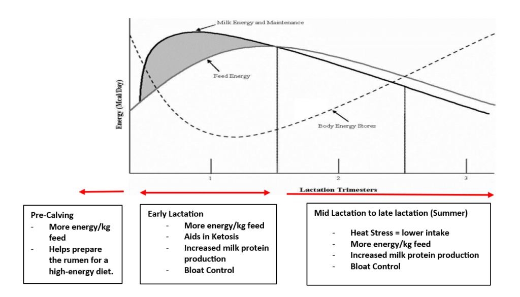Monensin has benefits for the cow through the entirety of her lactation cycle. The biggest response is in times when a cow’s energy intake is low: