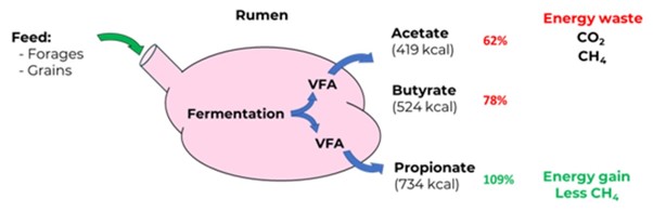 Propionate extracts more energy from feed than acetate by capturing more carbon that can be converted to energy instead of lost to carbon dioxide or methane. Thus, propionate is like rocket fuel and acetate is 91-octane fuel.